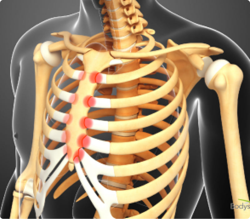 These are much less common than costo or Tietze’s, but occur for the same reason. When the joints where the ribs hinge onto your spine cannot move, other parts of the rib cage HAVE to move more to let you breathe. This extra ‘give’ can take place at the sides of the ribs, where the ribs change from bone to cartilage at the costochondral junctions. Treatment is the same logical approach as for costochondritis - free up the frozen rib joints around the back which are driving the problem.